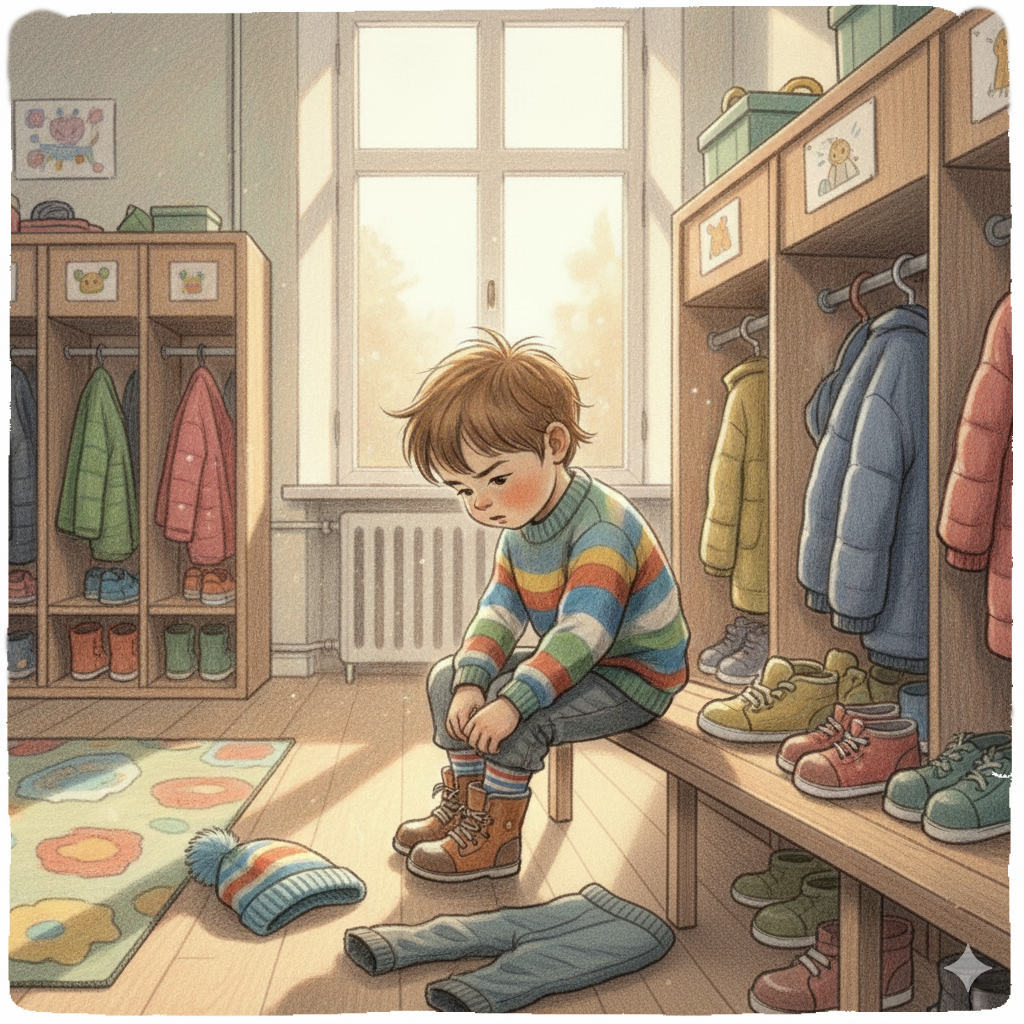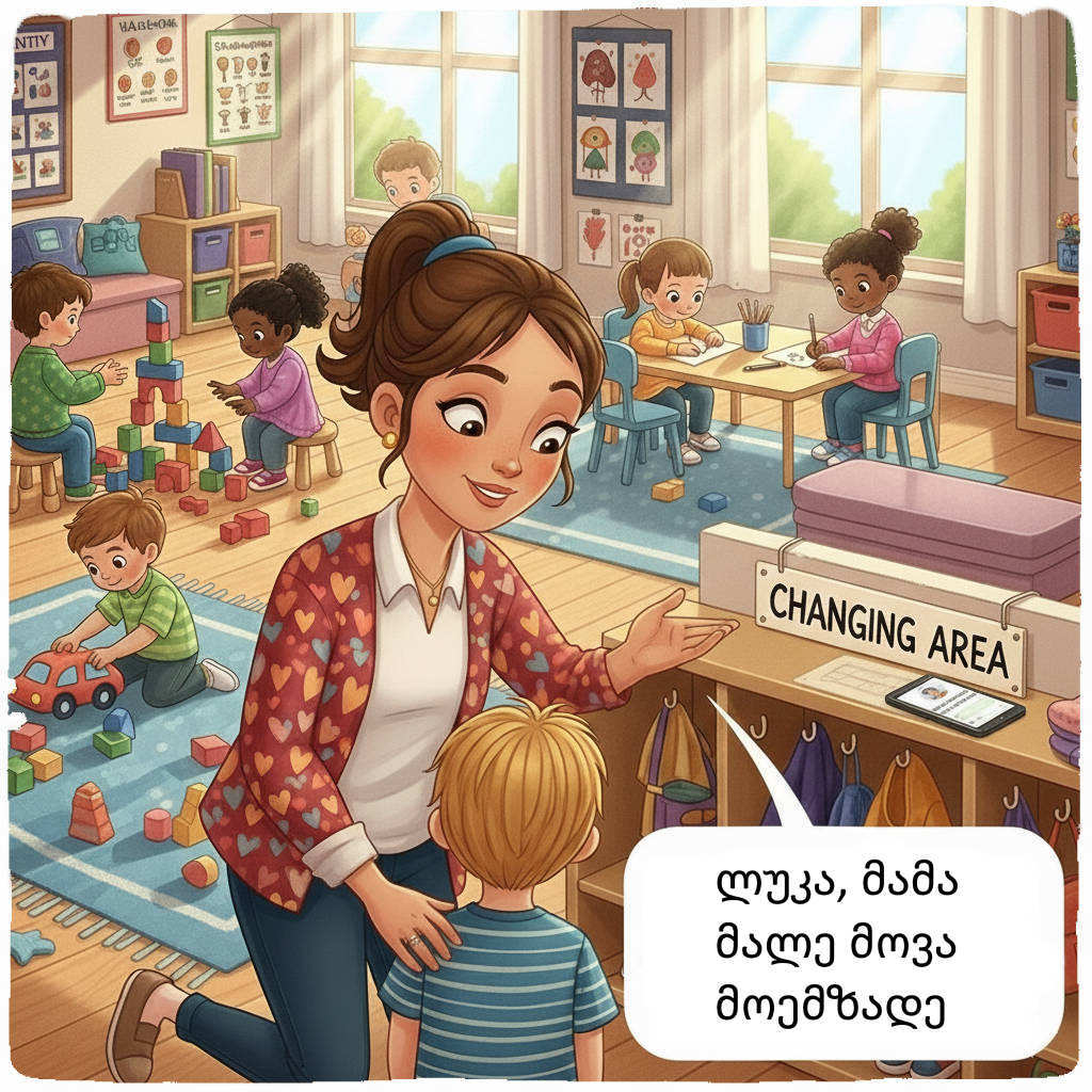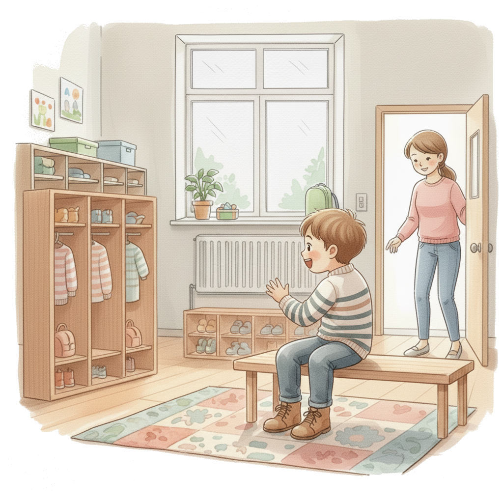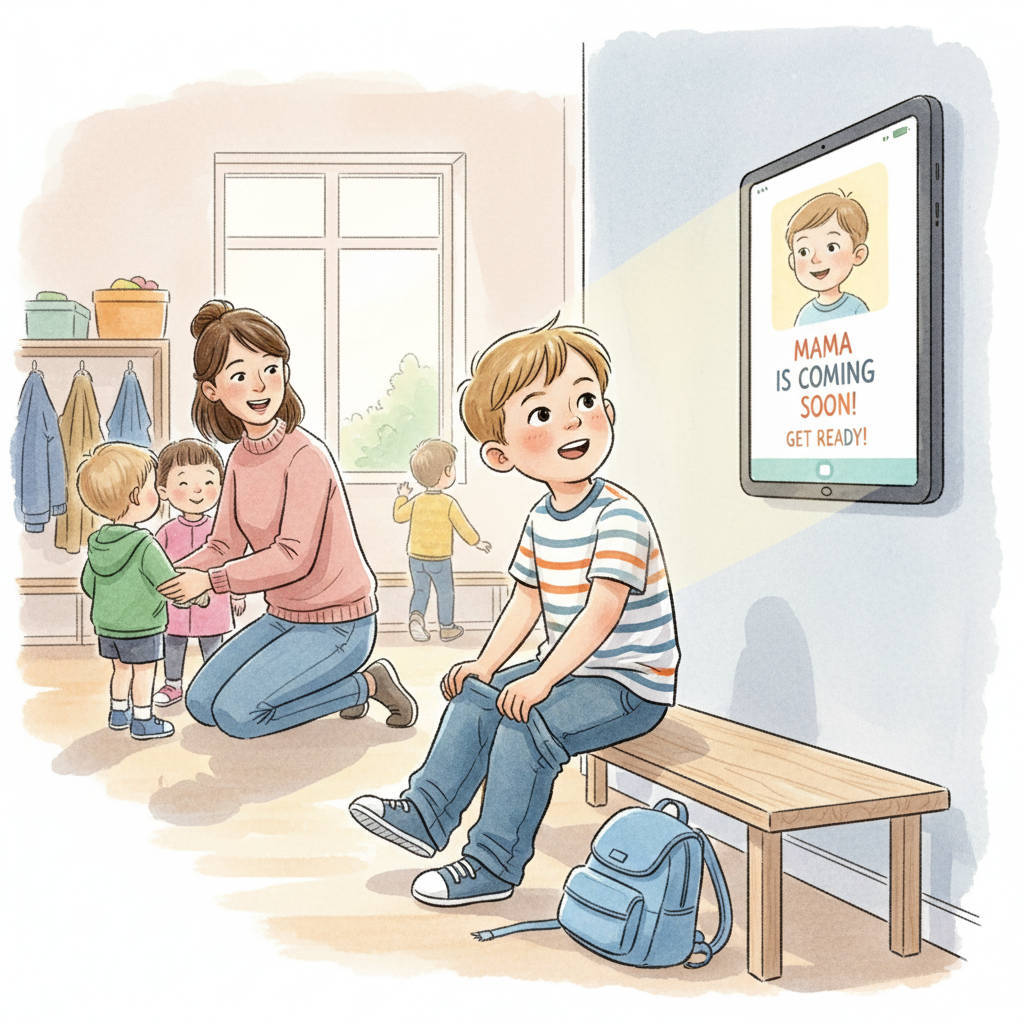 During peak hours, educators sometimes don't have enough time to dedicate to every child. Based on our experience, if a child sees notifications with their photo on a wall tablet, or if the educator tells them that a parent is coming soon, they will start getting dressed by themselves.